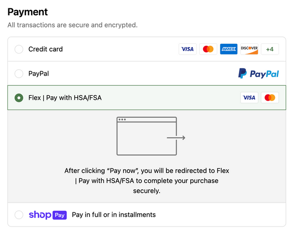 To use your HSA or FSA debit card, add products to your cart as usual. At checkout, select “Flex | Pay with HSA/FSA” as your payment option, enter your HSA or FSA debit card, and complete your checkout as usual. If you don’t see “Flex | Pay with HSA/FSA,” you may be in Shop Pay. Select “checkout as guest” to view more payment options.
